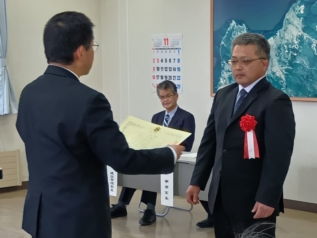 令和7年11月25日に、令和7年度北海道後志総合振興局 小樽建設管理部 維持・除雪功労者表彰式が行われ、弊社社員が北海道後志総合振興局長 滝川 雅晴様より感謝状をいただきました。